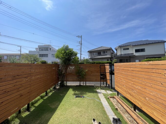 北側の共用廊下からの玄関だけで無く、庭側にも新たに玄関を設けたちょっと変わった間取りになりました。