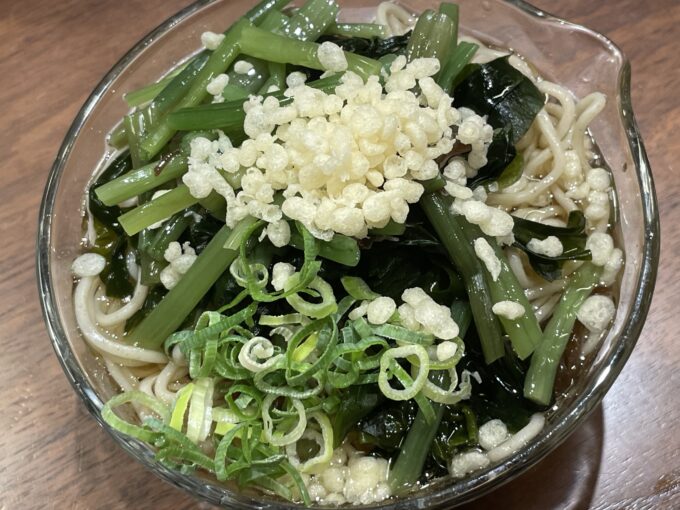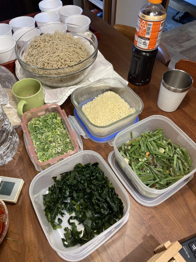 土曜日の夏祭りで提供した蕎麦の余りがあったので、お昼ご飯は山菜蕎麦の賄い。
