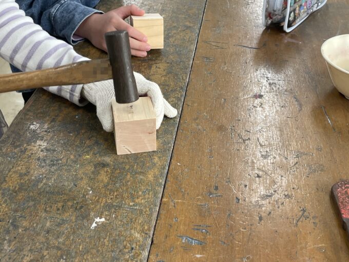 4寸のクギを曲げずに打ち込むことが如何に難しいかを体感してもらいました。