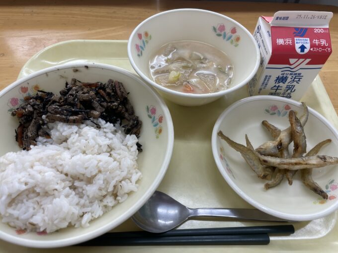 今日の給食は小魚のから揚げとヒジキ載せ麦ごはんと呉汁。