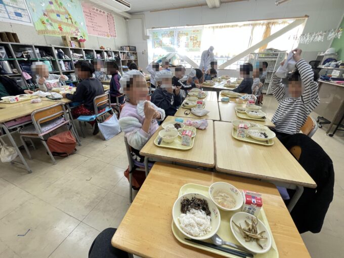 授業の後は、図工室から教室に移動して、一緒に給食も頂いてきました。