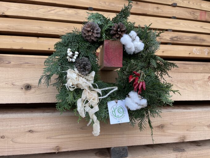 その後は山で採ったヒノキの葉をを使ったクリスマスリース作り。