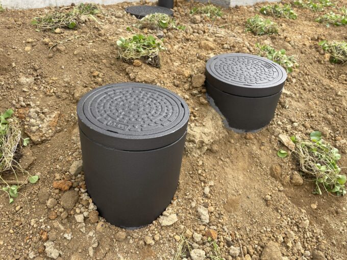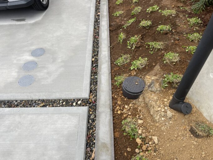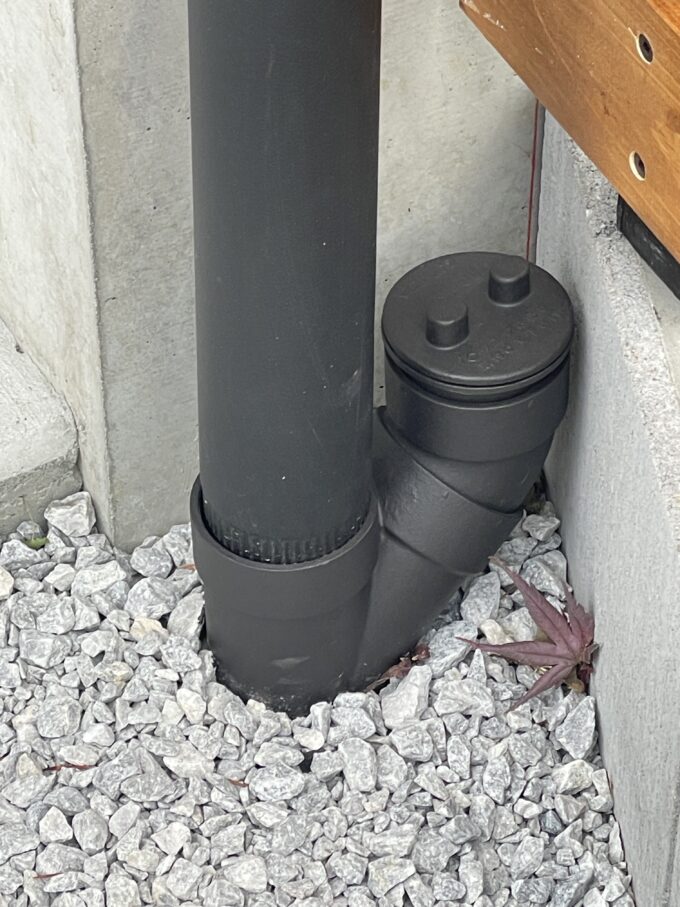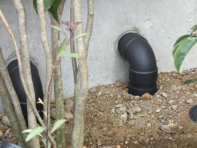 傾斜地で植栽が育つまでは、汚水配管が目立ったので、配管を黒く塗ってもらいました。