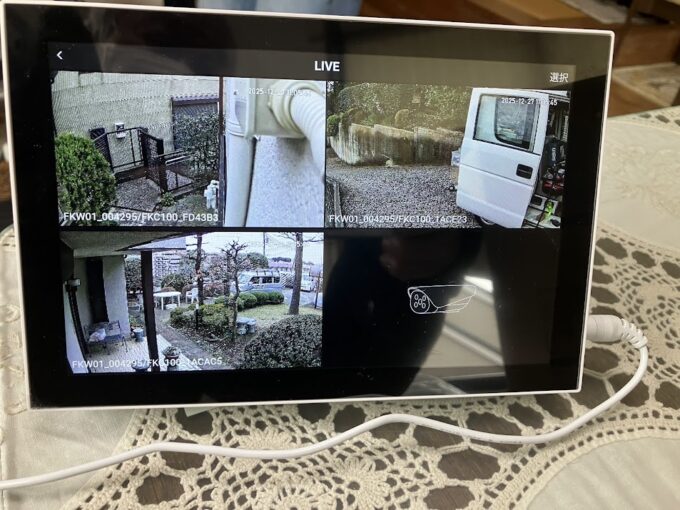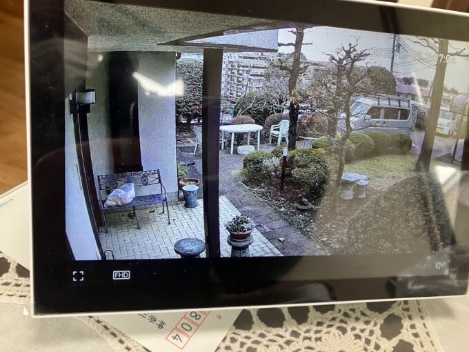 こんな風に映ります。普段はモニターは消えていますが人が動くと音が鳴ってモニターに映り、録画されます。電源工事が取付個所個々に必要ですが、映像はWi-Fiなので無線で配線工事は必要ありません。
