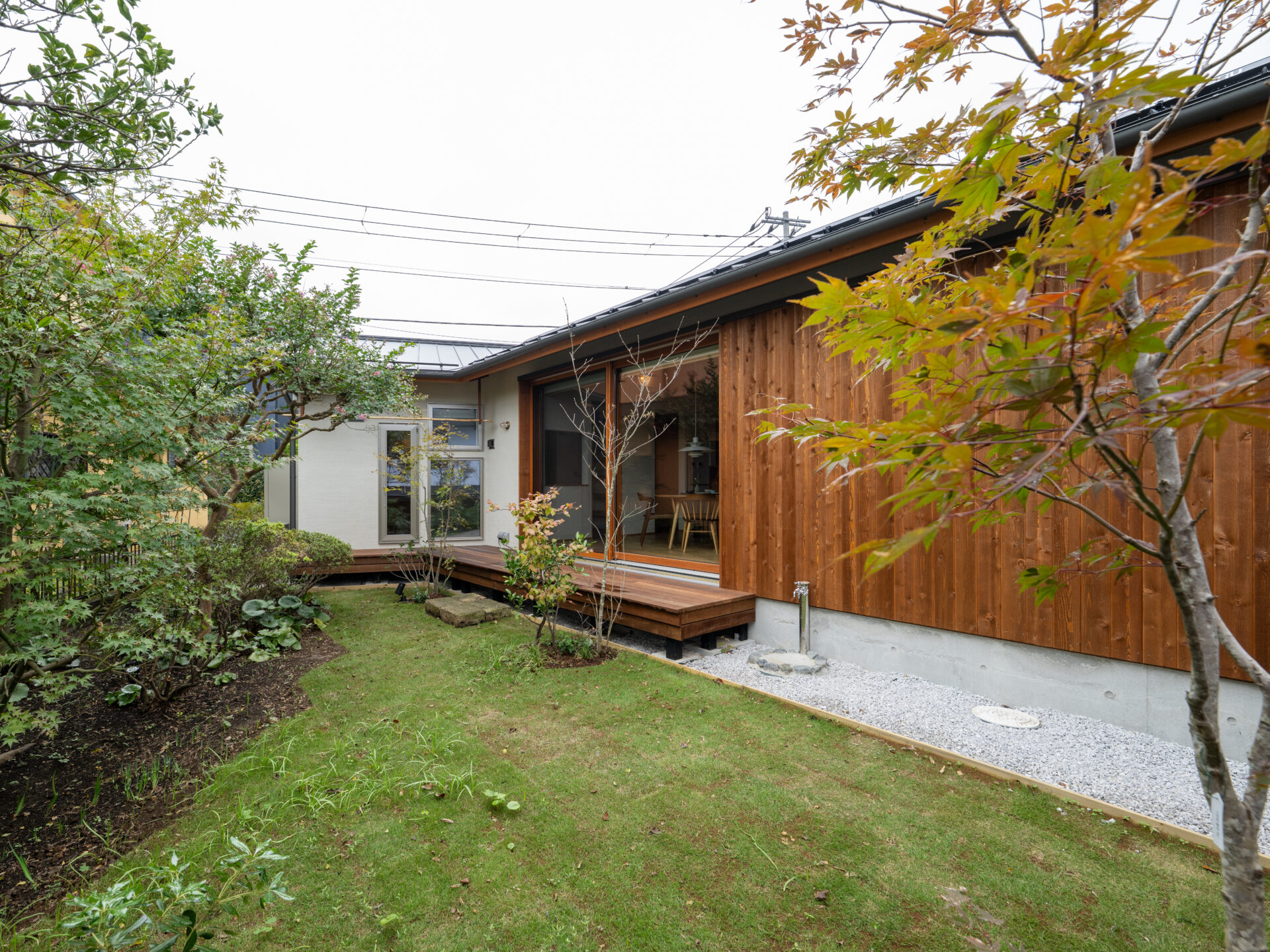 躯体を「への字」に折り、南に正対させることで、住まいが緩やかに庭を囲い込む構造となっています。
