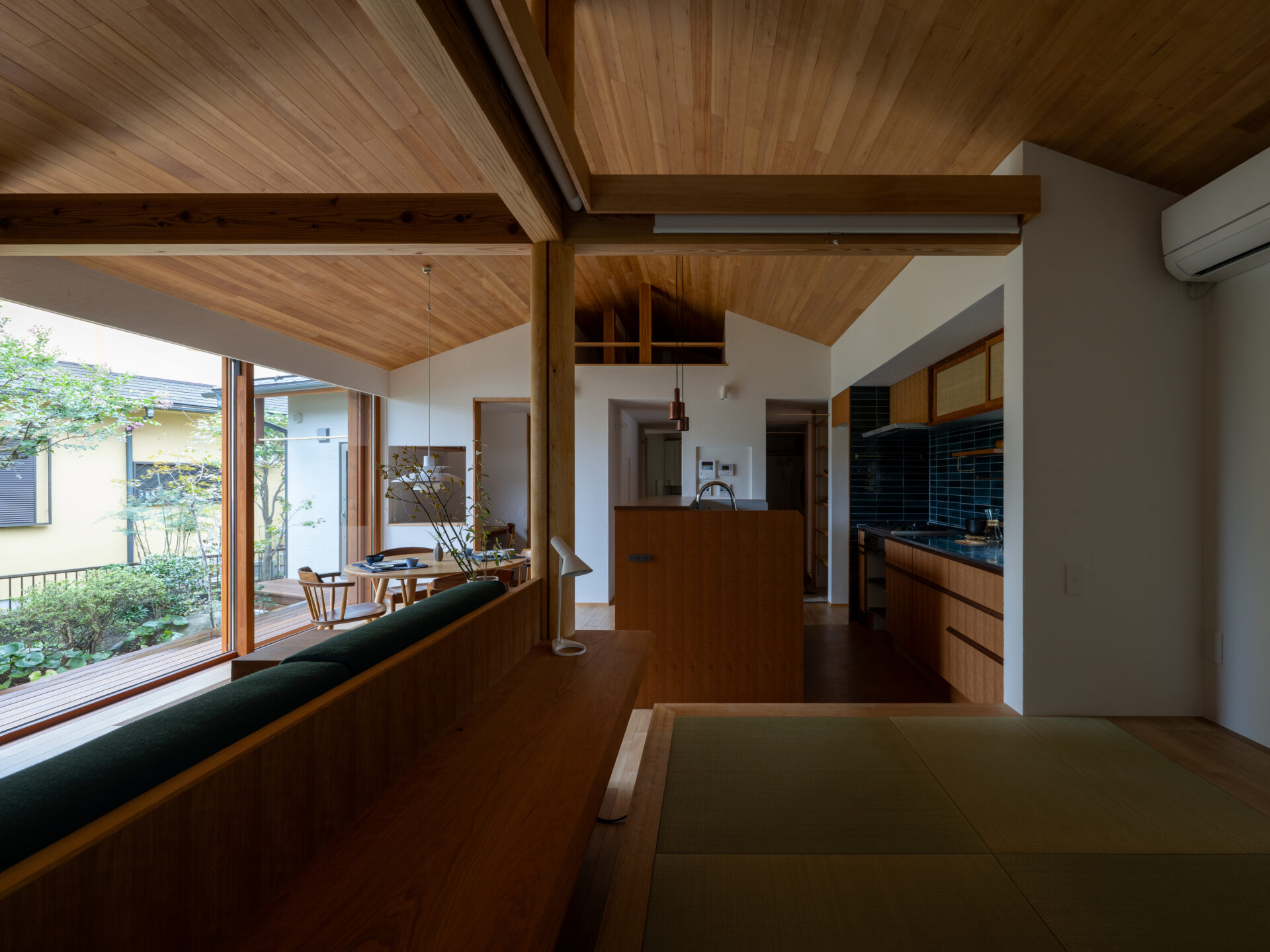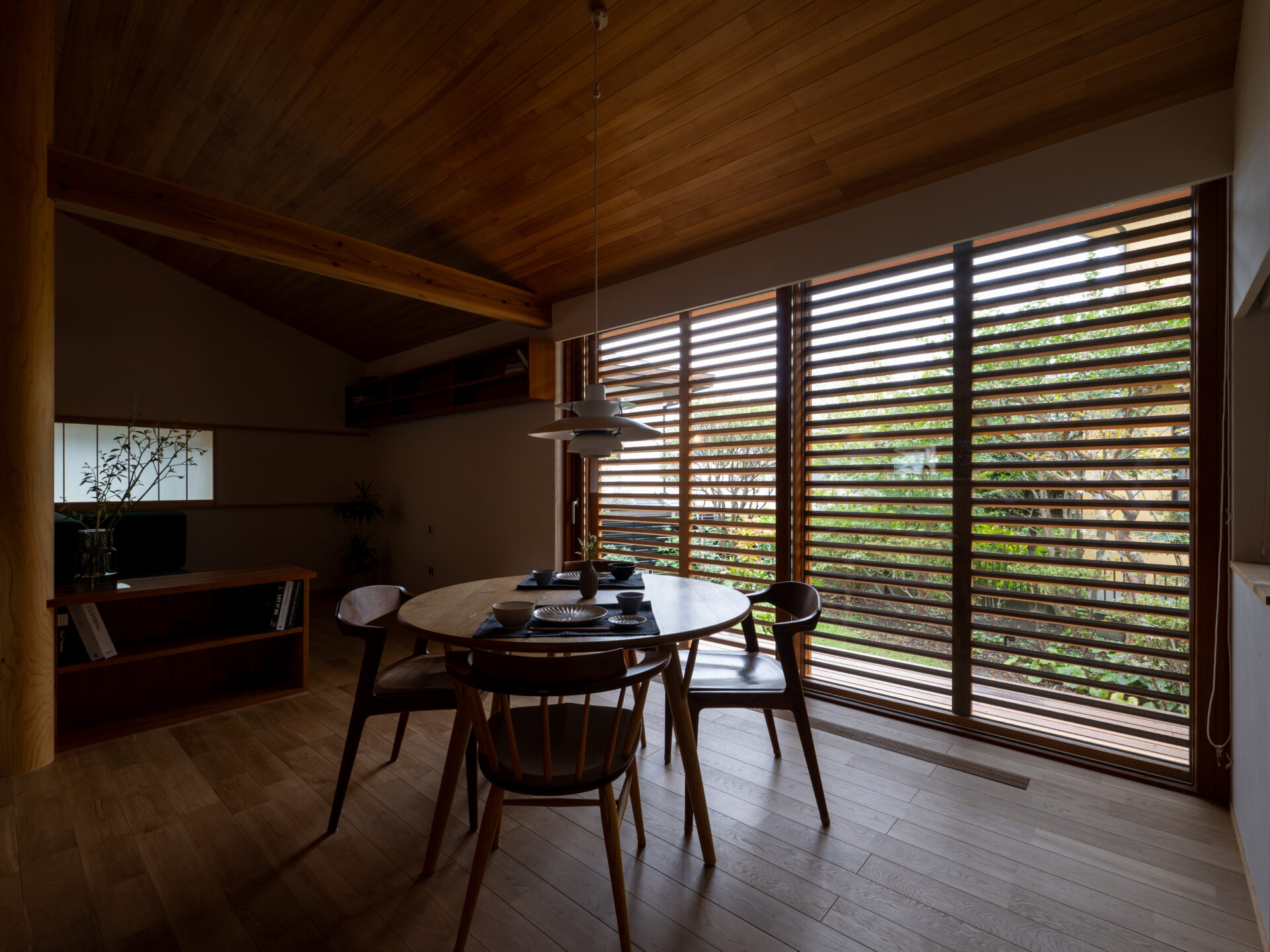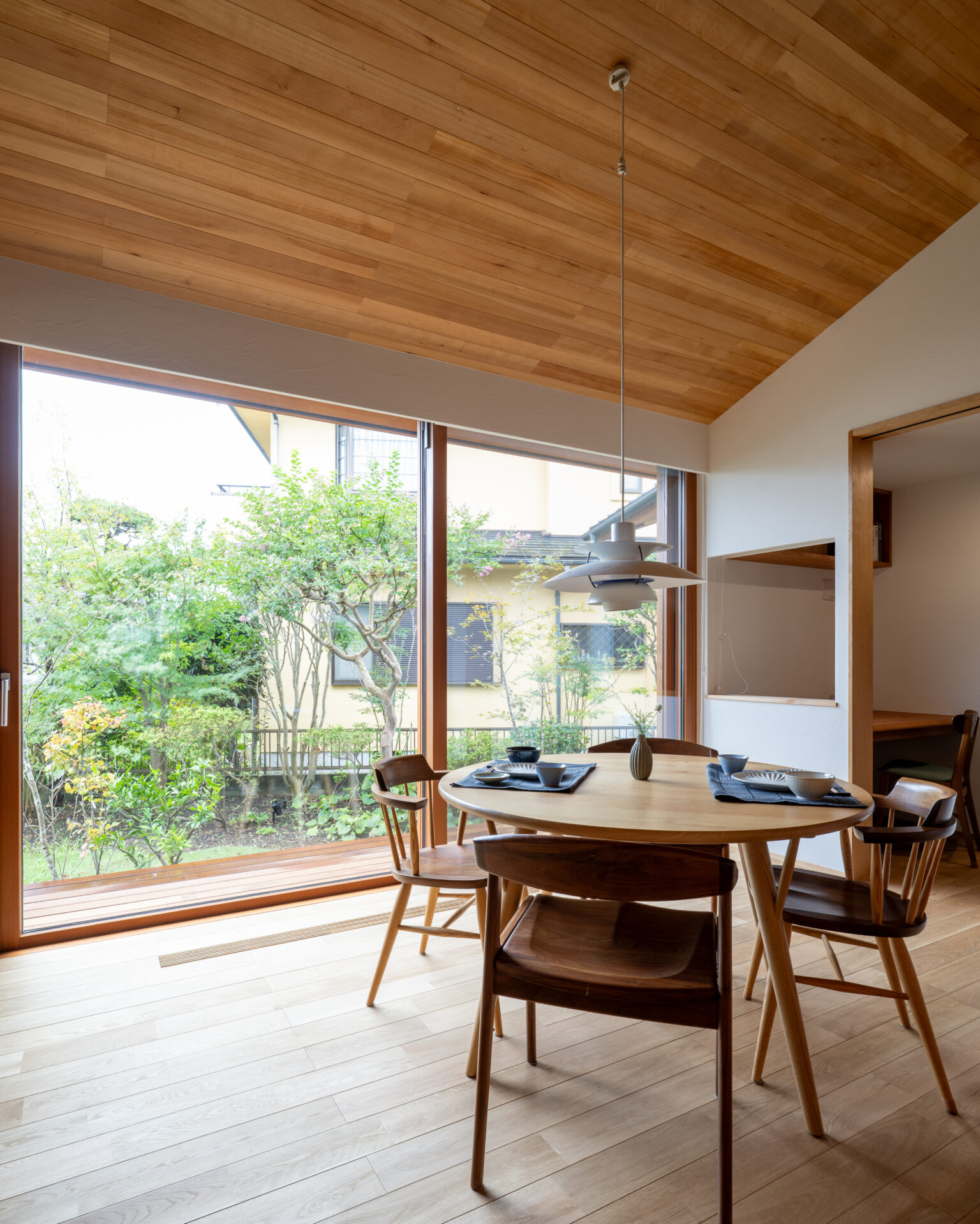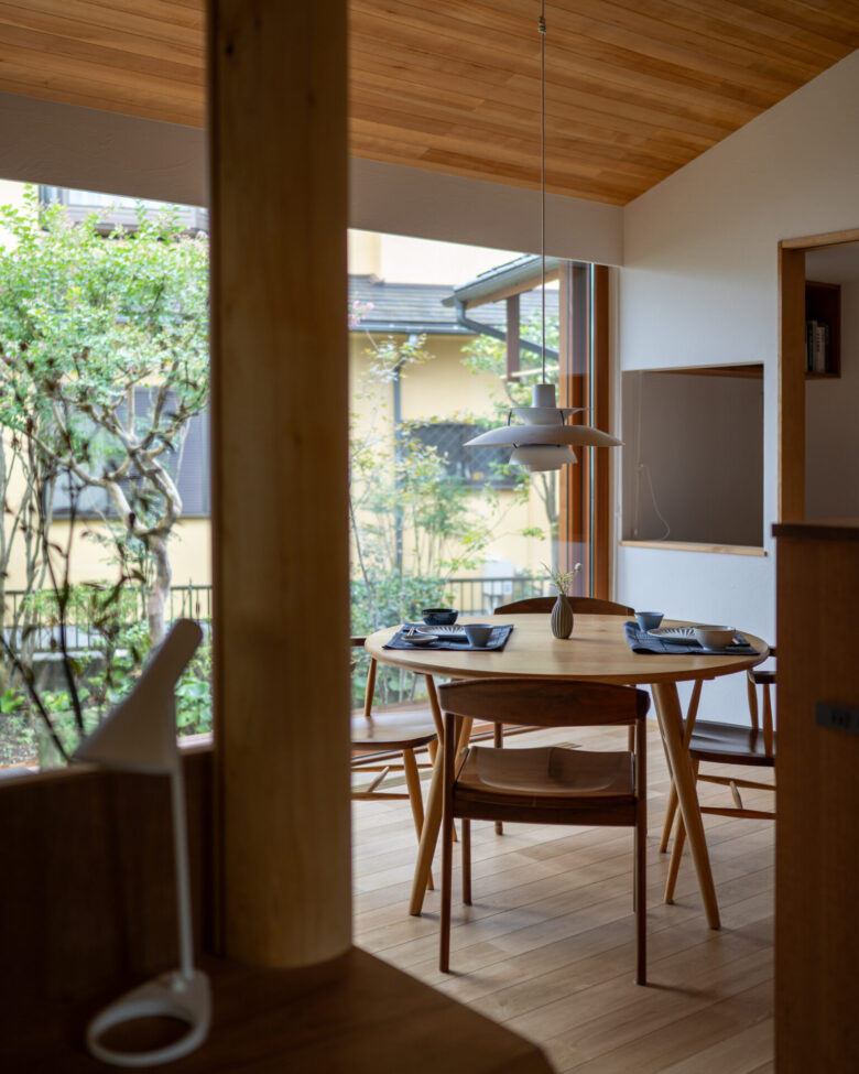 緩やかに庭を囲い込む構造と、厳選された素材によって丁寧にしつらえられた空間で、しっとりと穏やかな時間を過ごす。