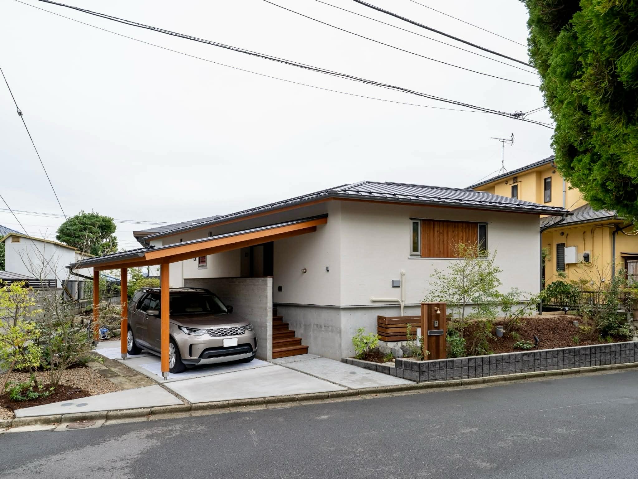 雨の日でも濡れることなく、快適に車の乗り降りができるよう、住まいに接続した屋根付きのガレージを設けました。