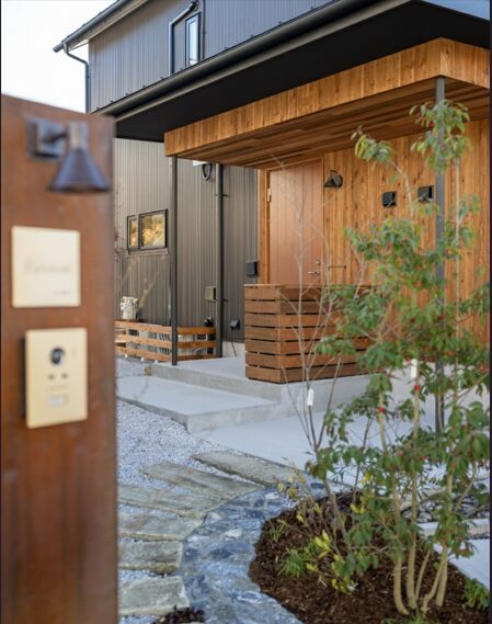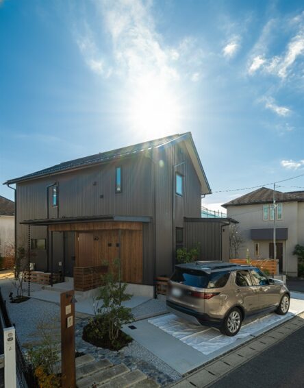 外観はシャープなガルバリウムの外壁に、天然木の豊かな質感が調和しています。