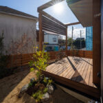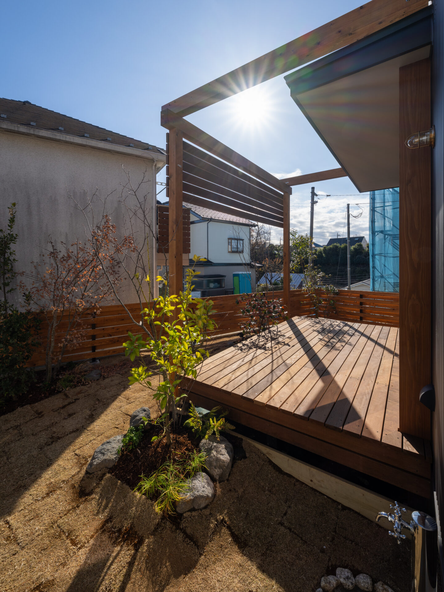 変形敷地の余白を活かしたこの場所は、季節の風を感じるアウトドアリビング。