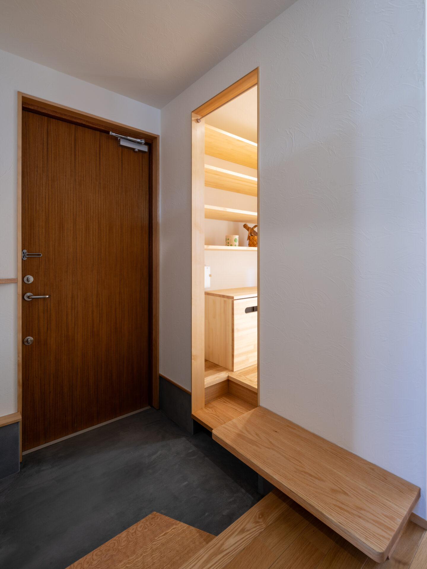 玄関に据えられた重厚な木製ドアは、触れるたびに本物の質感を伝え、毎日の暮らしを豊かに彩ります。
