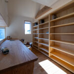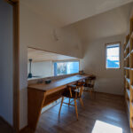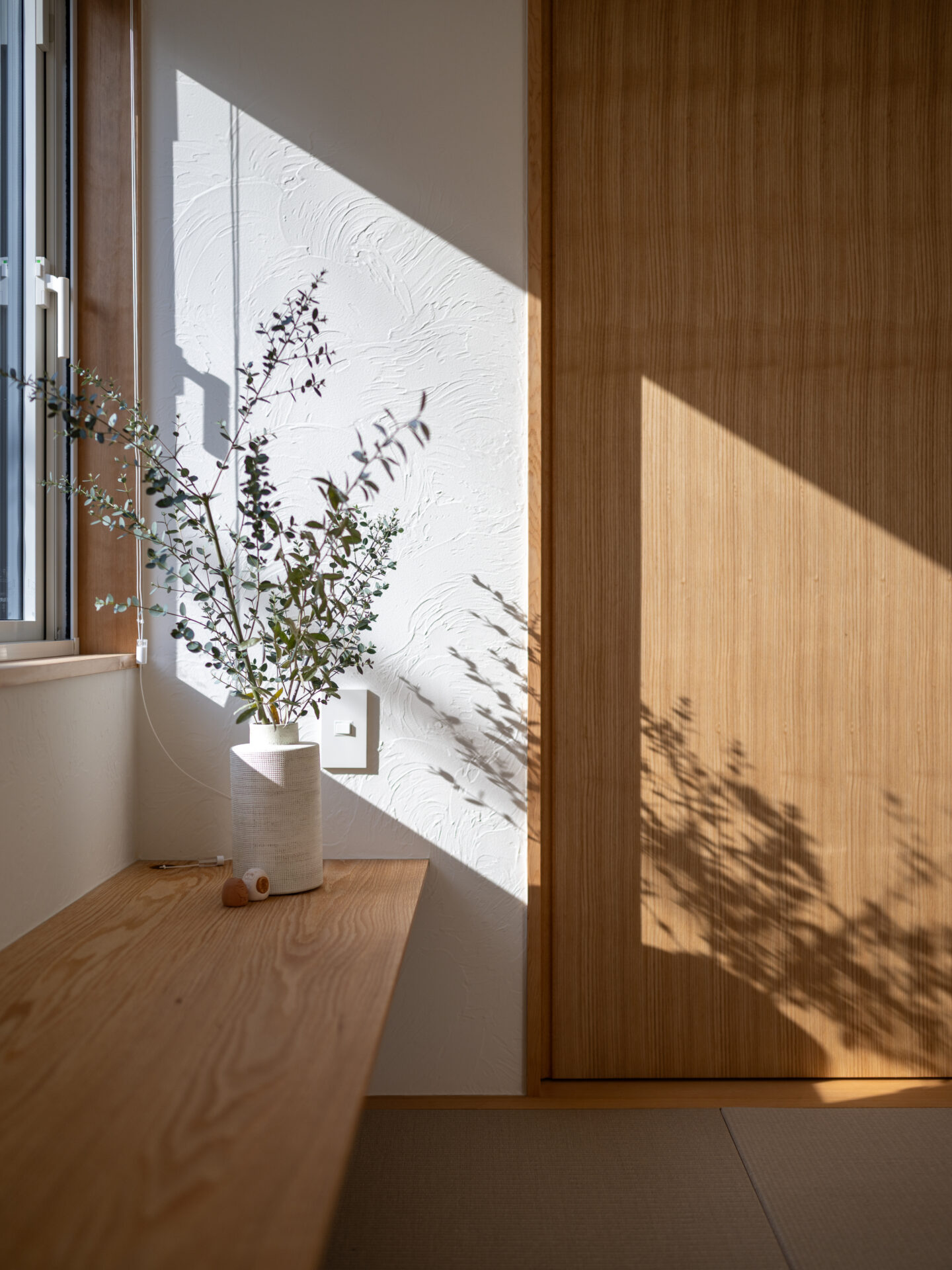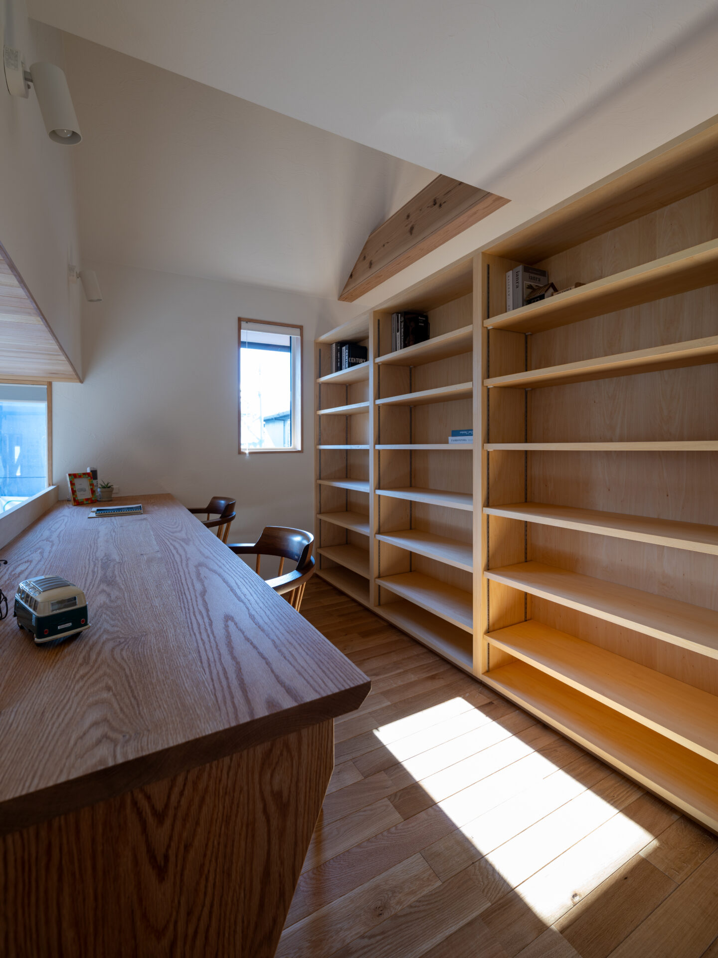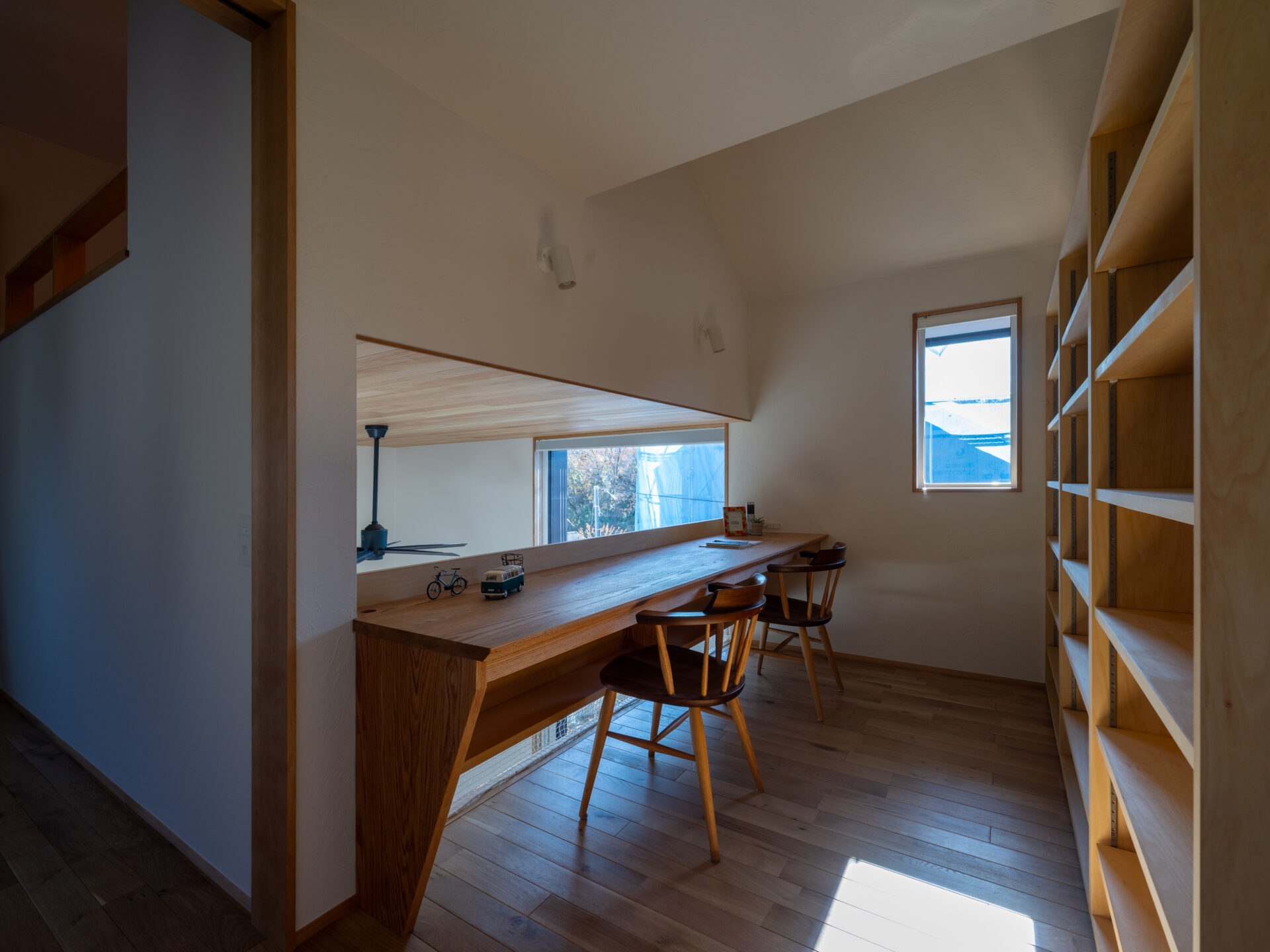 窓辺に長く伸びる造作デスクや収納棚は、暮らしのシーンを想定して大工が丁寧に作成しました。