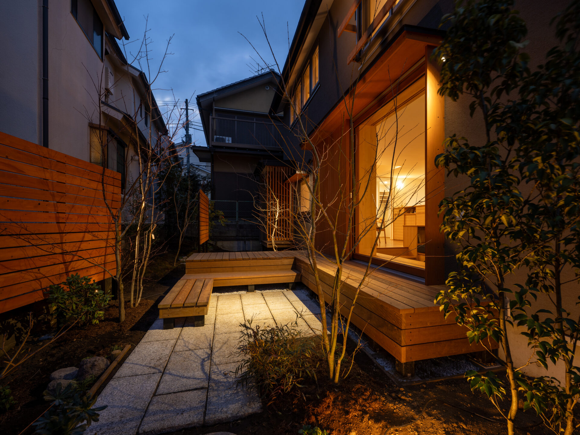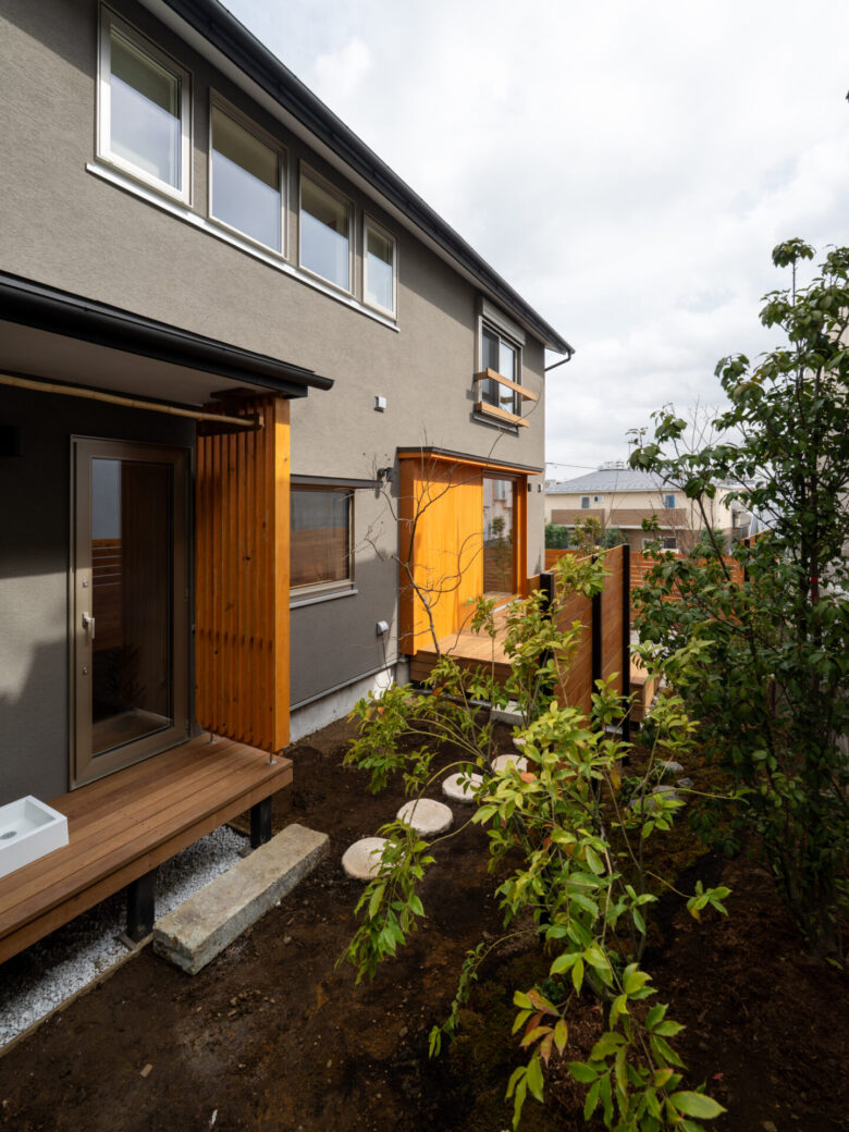 ポイントごとに配置された植栽が、春夏秋冬の訪れを告げ、風の音や木々の香りが住み手を優しく家へと導きます。