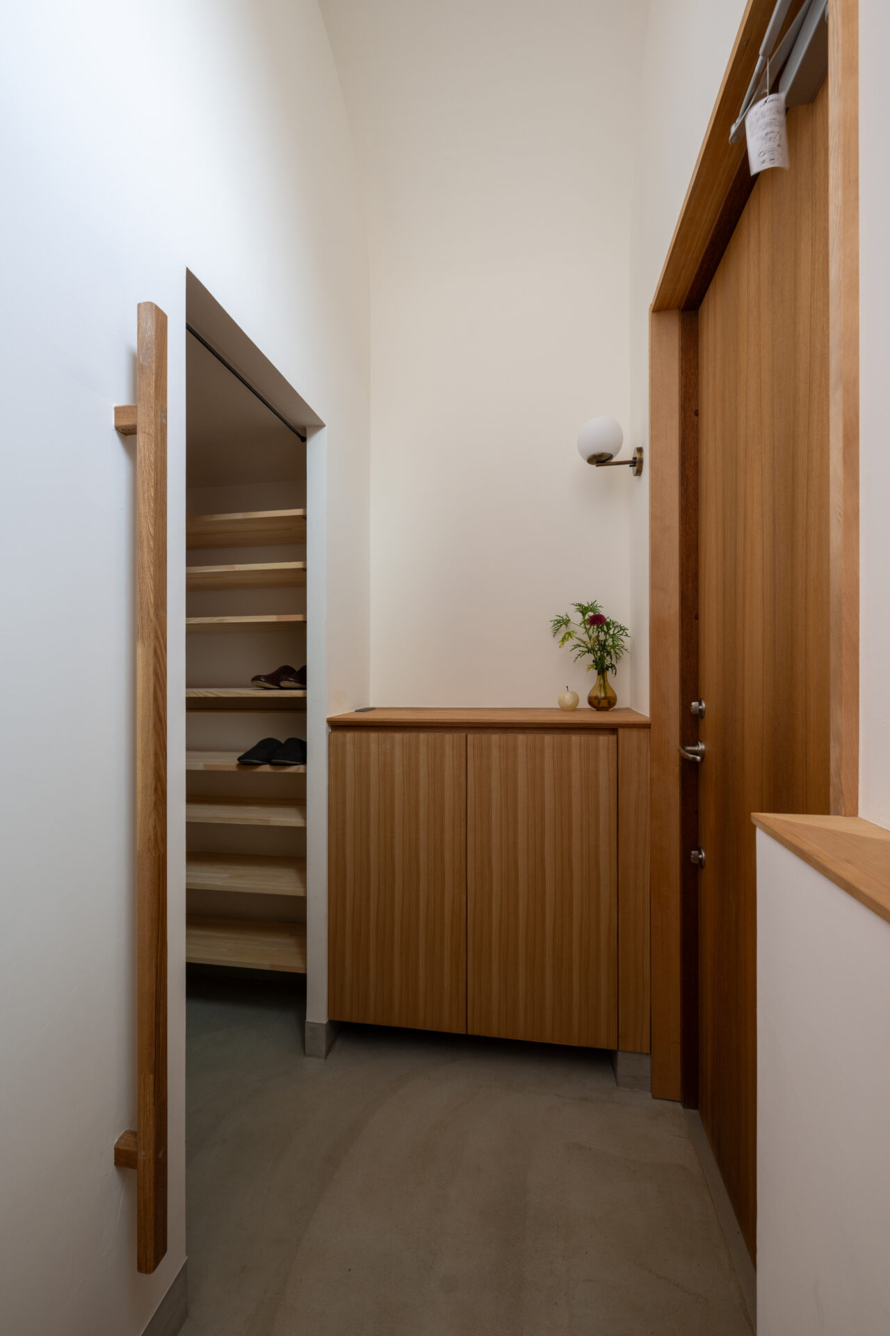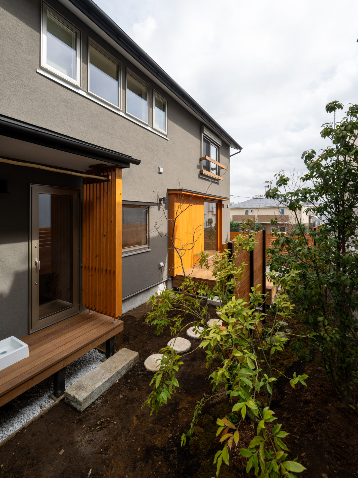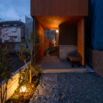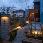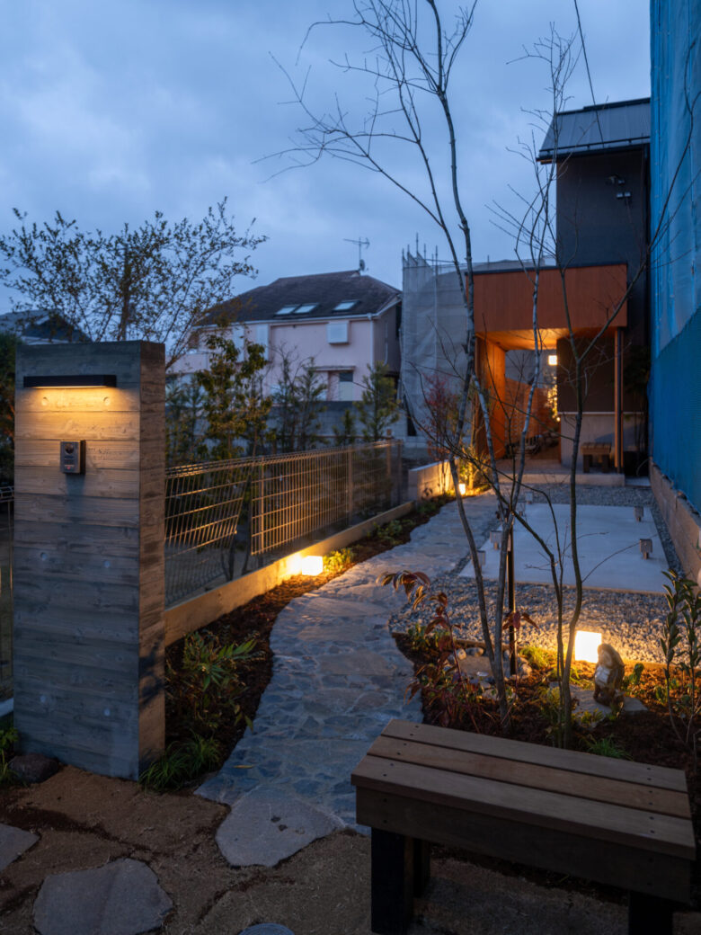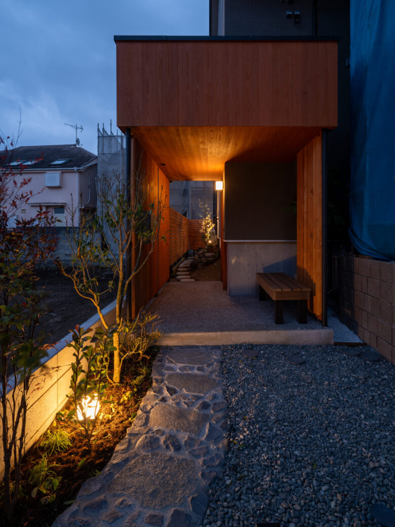 旗竿地特有の長いアプローチを、単なる「通路」ではなく、心静かな日常へと誘(いざな)う路地として再定義しました。